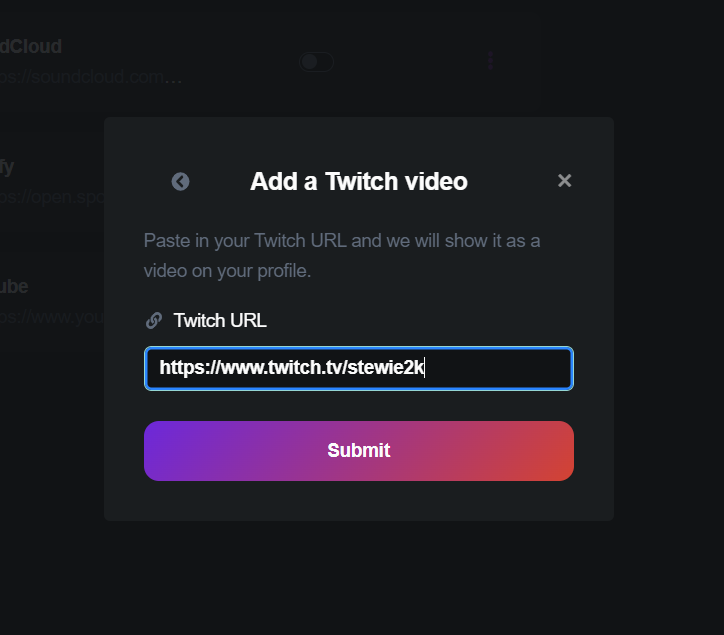 * After pasting the Twitch URL, click on the "Submit" or "Save" button in the pop-up window.