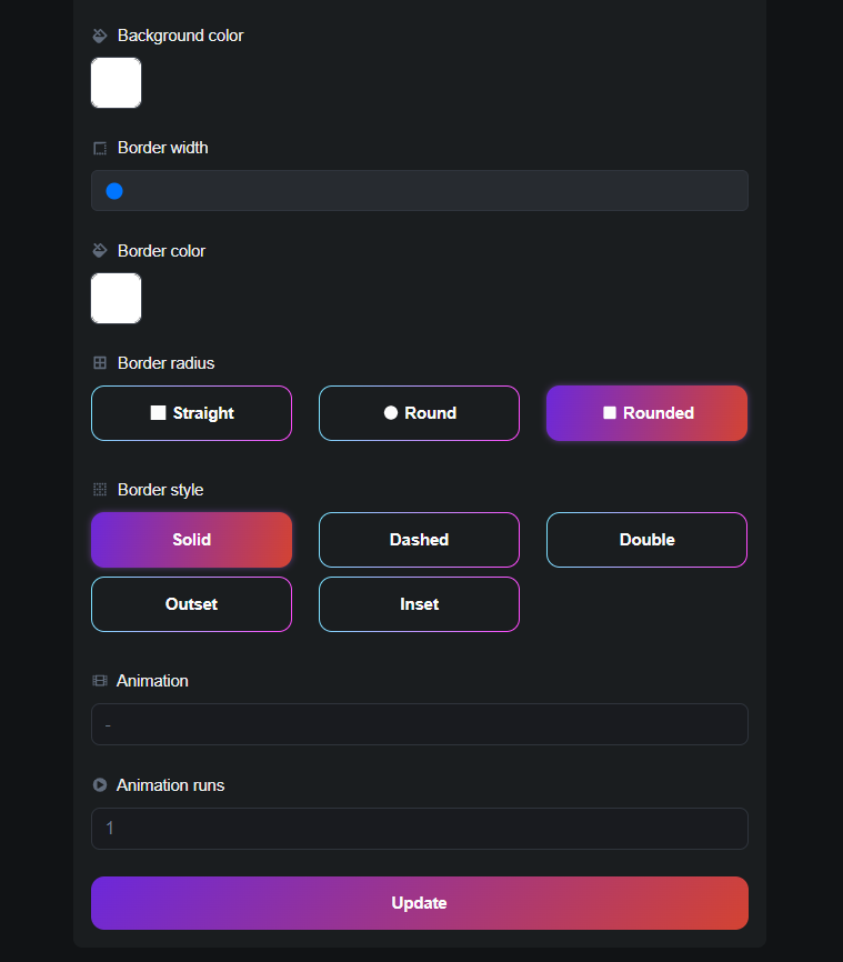 * Animation and Animation Duration: Apply animations to the button and specify the duration of the animation.