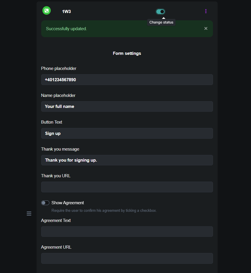 * Show Agreement Toggle: Choose whether to display an agreement or terms of use checkbox.
