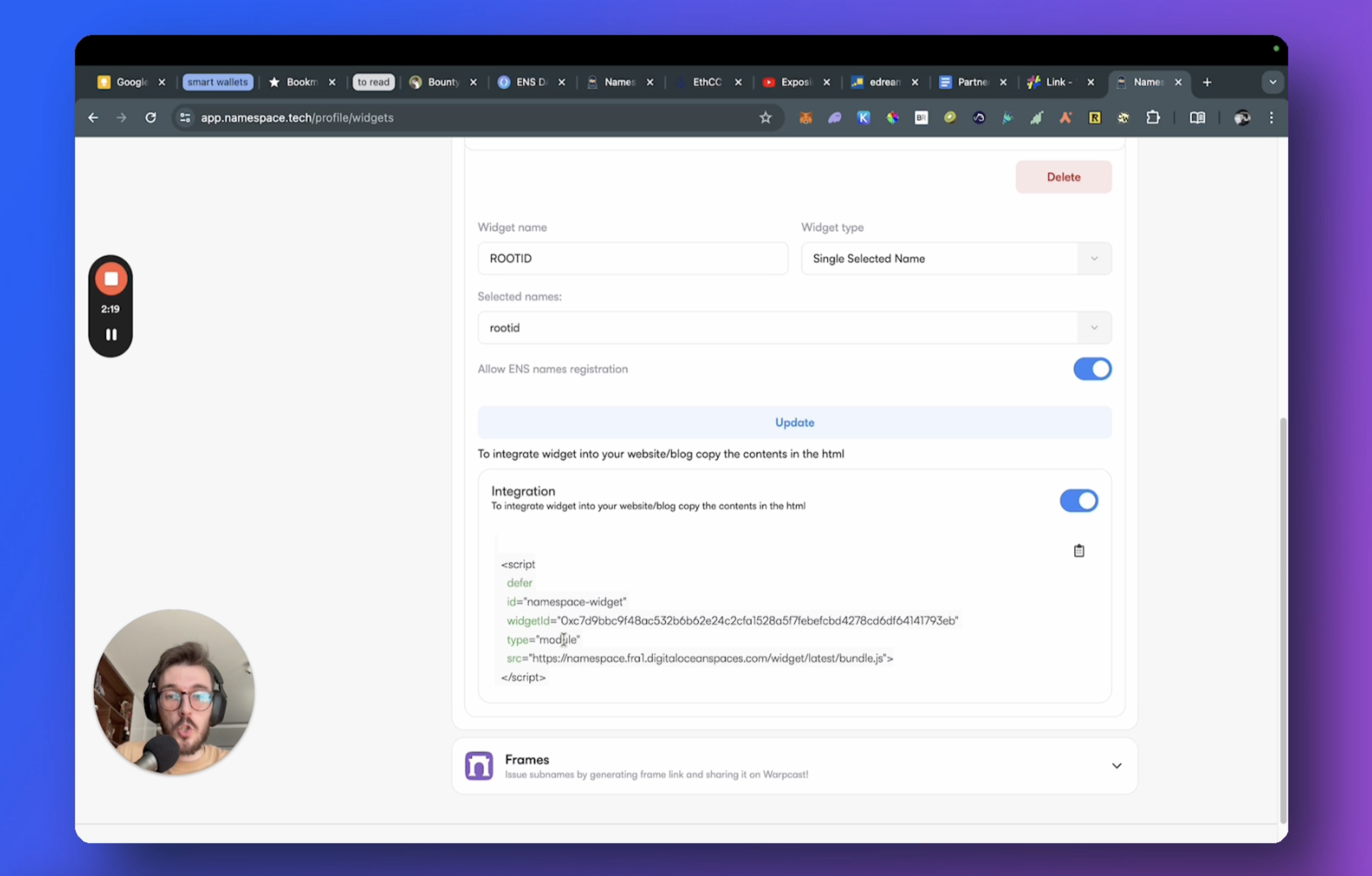 * Select the desired ENS name and the **Widget ID** will be displayed for use.